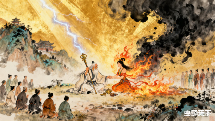 广成子和火灵圣母本是好友,商量着用仙法引水。